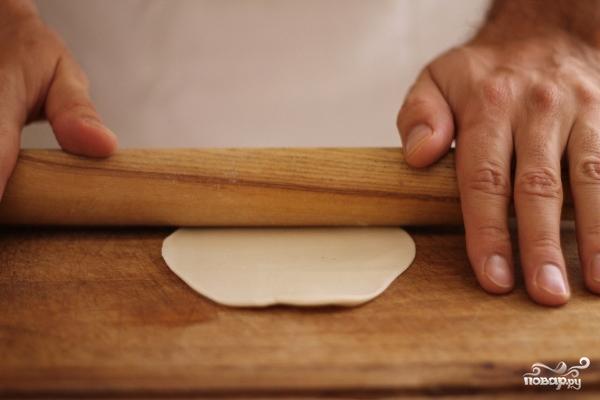 Уже готовое тесто разрезаем на небольшие кусочки, каждый из которых раскатываем в тонкий пласт - так. как на фото.