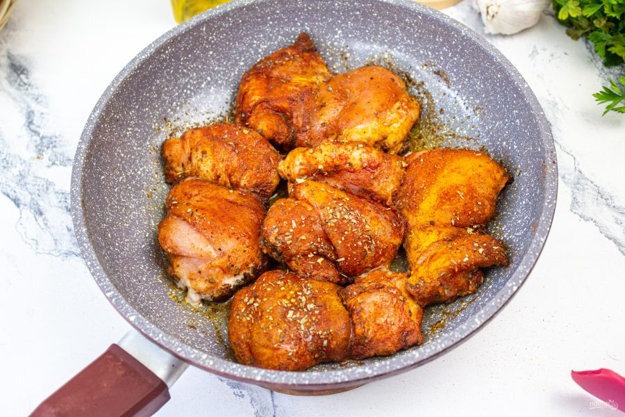 Подготовьте все необходимые ингредиенты. Куриные бедра возьмите без кожи и костей. Специи можете взять на свой вкус.