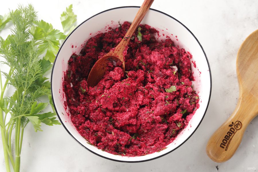 Переложите подготовленную свеклу в глубокую миску. Добавьте манку, давленные зубчики чеснока, рубленную зелень, соль и перец по вкусу.