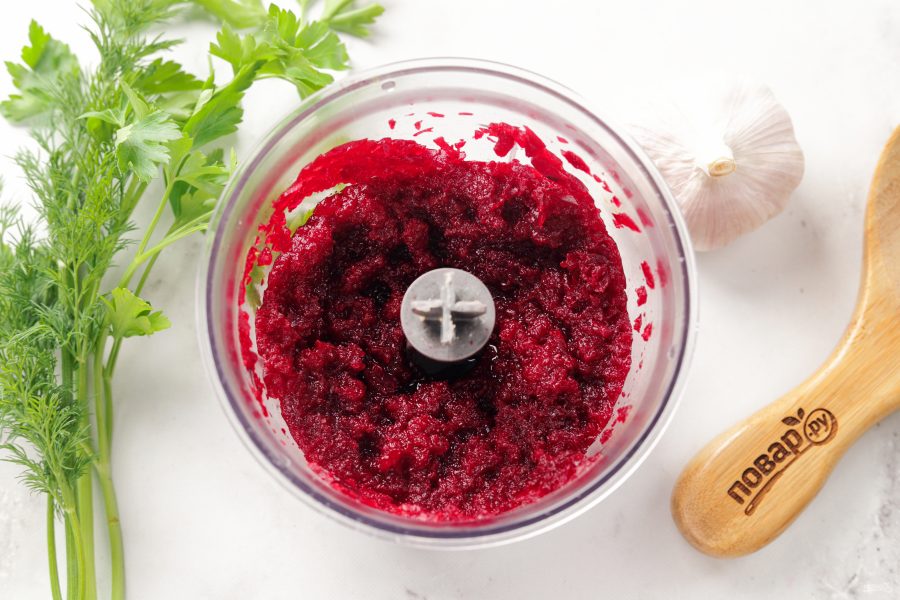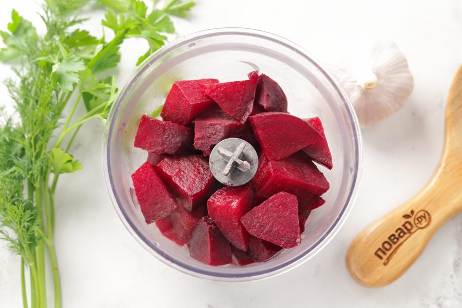 Запеченную свеклу очистите от кожуры и промойте. Нарежьте небольшими ломтиками в чашу кухонного комбайна.
