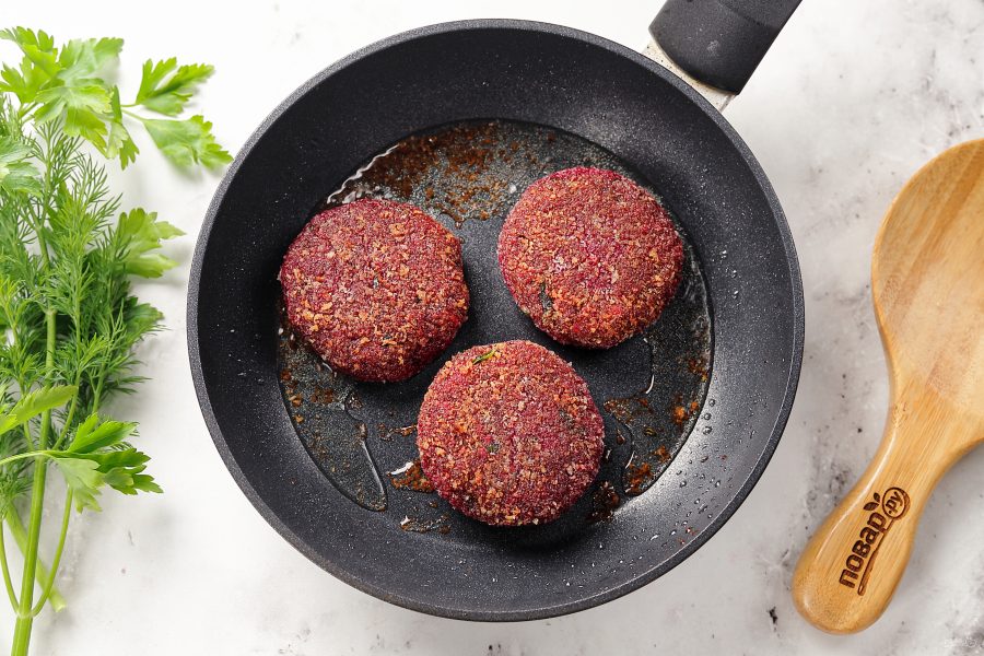 Раскалите на плите сковороду с растительным маслом и обжарьте в нём свекольные котлеты по 1-2 минуты с каждой стороны на среднем огне. Не доводите корочку до тёмного цвета - котлеты, по сути, и так практически готовы.