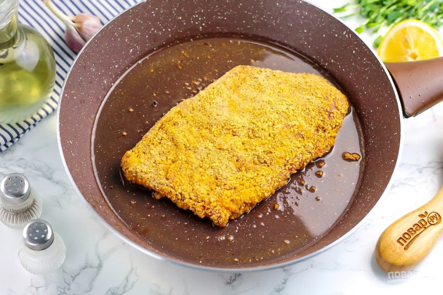 Прогрейте сковороду на плите, влейте растительное масло. Можно заменить его сливочным или смальцем — жир нужно хорошенько разогреть. Обмакните говядину в льезон со всех сторон.