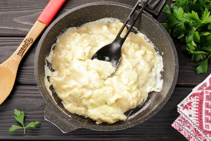 Затем сразу же начните перемешивать яйца лопаткой в разные стороны, не допуская образования больших кусочков. Готовится всё очень быстро, от силы пару минут.