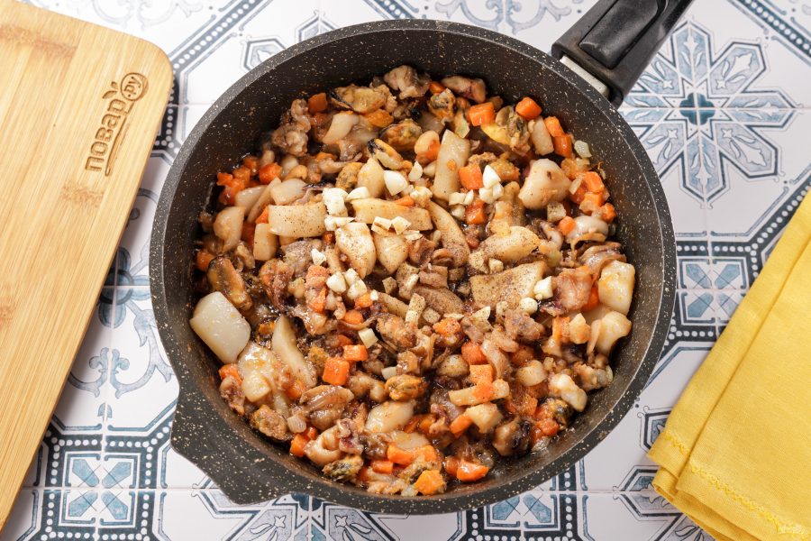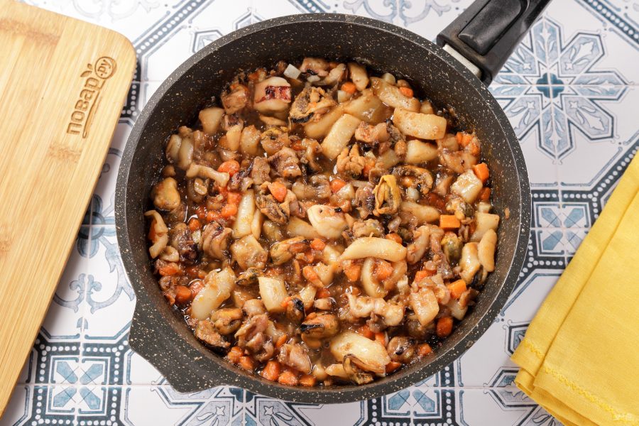 Добавьте морепродукты.