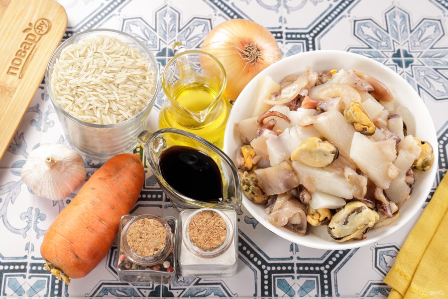 Подготовьте все ингредиенты по списку. Морепродукты разморозьте в холодильнике, а затем промойте. Я использовала коктейль из морепродуктов: варено-мороженые мидии, осьминоги и кальмары.