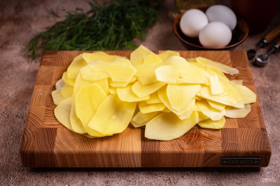 Картофель почистите, помойте, нарежьте тонкими ломтиками.