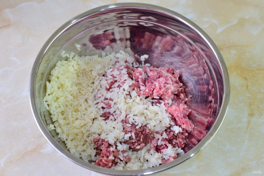 В чаше соедините мясной фарш и отварной рис.