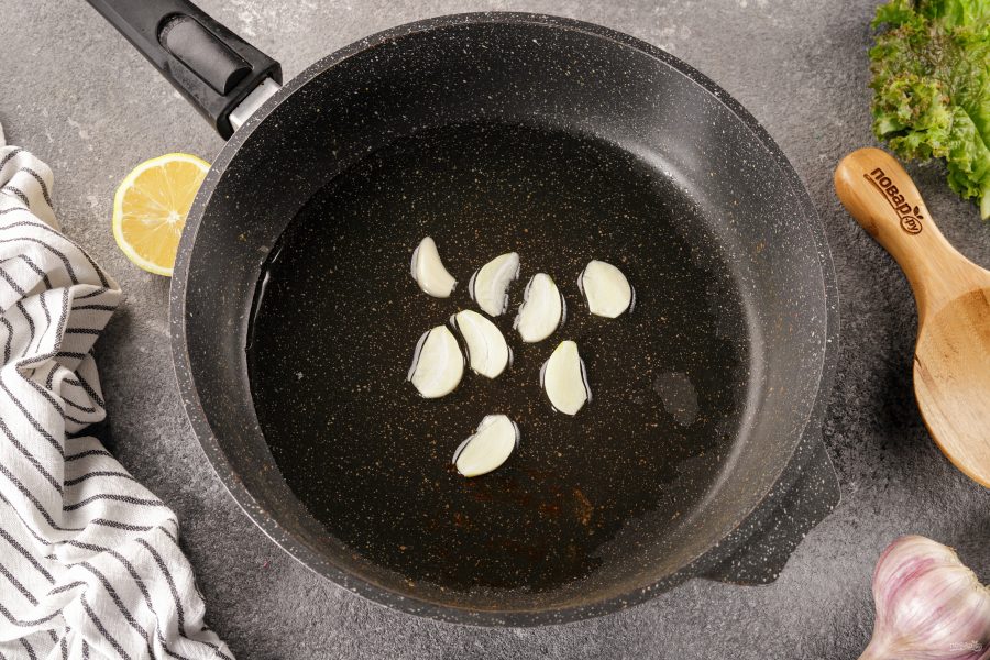 На разогретую сковороду с маслом выложите нарезанный пластинами чеснок.