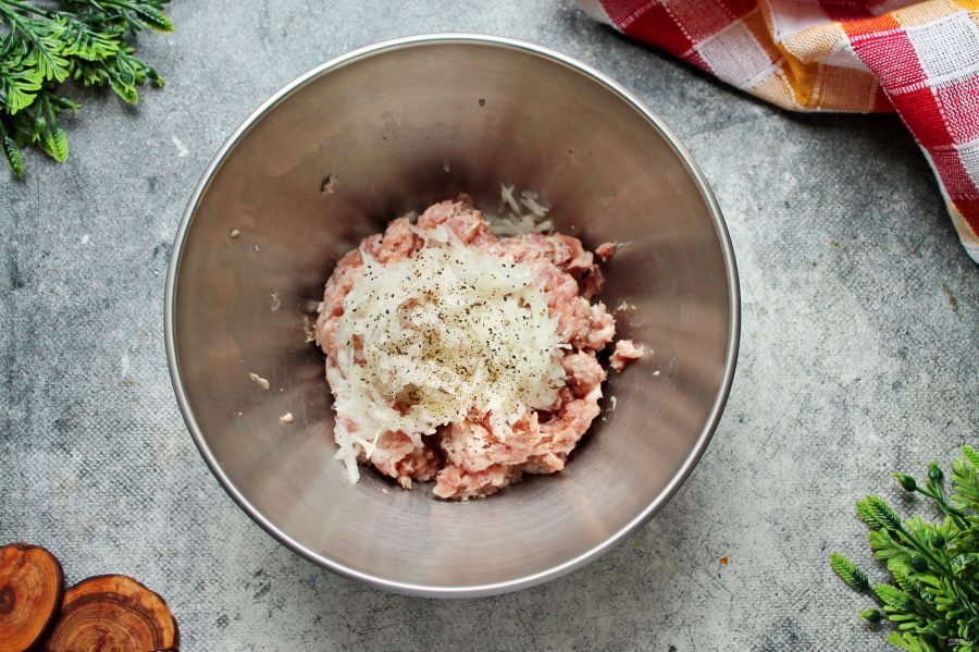 В миску выложите мясной фарш и добавьте измельченный репчатый лук. Его можно измельчить при помощи блендера, мясорубки или натереть на крупной терке.
