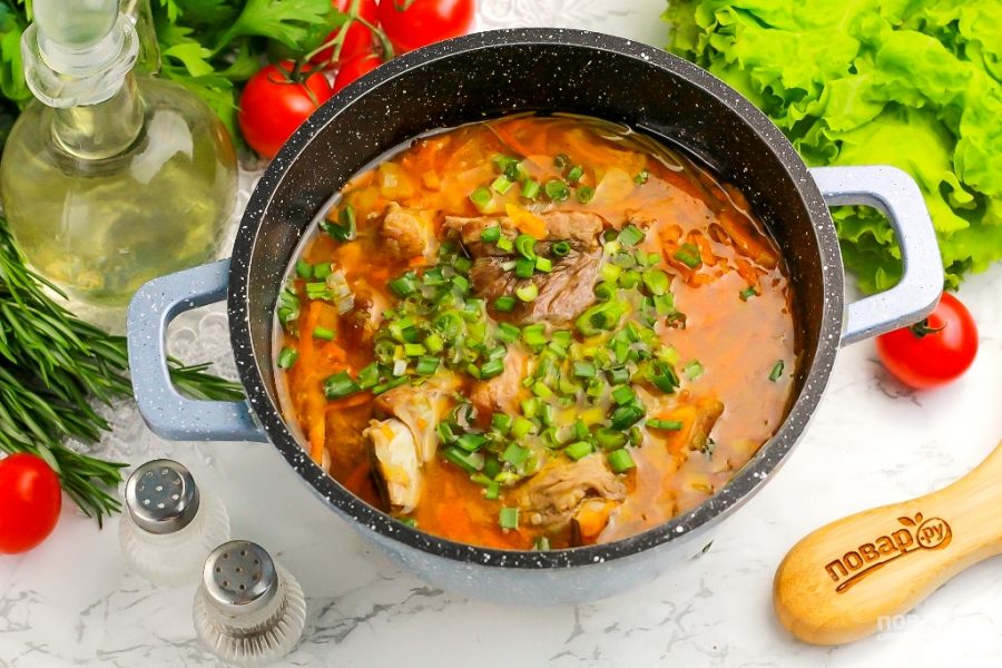 Затем измельчите зеленую часть лука и всыпьте в емкость. Если есть другая пряная свежая зелень, то добавьте и ее: укроп, петрушку, кинзу и т.д. Протушите 1-2 минуты и выключите нагрев.
